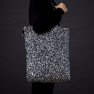 This tote bag was designed to compliment the Comp notebook by Aron Fay. With its all over print exterior, black cotton interior, cotton handles, and custom Comp label, this is an eye-catching bag made to comfortably carry your goods.